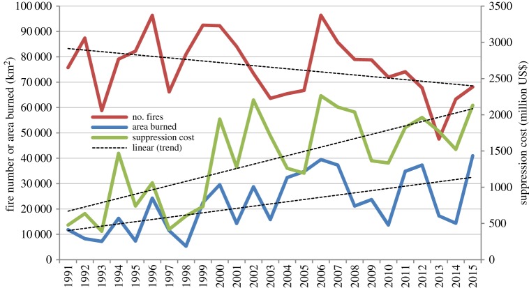 The second question Mike raised is whether fires are increasing. This seems to depend on which parts of the world and which study you look at, and which parts of the study. The BBC says fire has not increased worldwide over 4 areas they studied since 2002. https://www.bbc.com/news/world-49515462 The Royal Society concluded that the increase in fires is less than what is perceived, and yet they posted a graph showing global area burned has almost tripled since 1990. https://www.ncbi.nlm.nih.gov/pmc/articles/PMC4874420