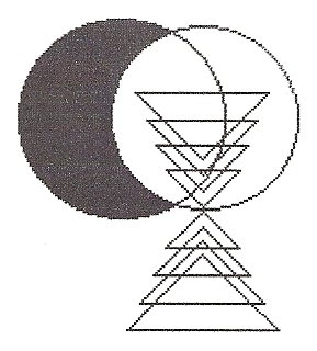 On the right is a simplified impression of the Hindu "Shri Yantra" symbol, which represents creativity and openness to the divine. Just as yin and yang, and Sun and Moon, represent the "right and left" halves of our mind and body, the Shri Yantra can represent the axis that links heaven and earth through our backbone and the 7 chakras, which correspond here to the 7 points of the pyramids pictured in the symbol. The top pyramids flow downward from heaven, and the bottom pyramids flow upward from earth, meeting in the center (the heart chakra). I later discovered that this image is also related to the "zero point" symbol, and to the "holy grail" symbol described on the last page of the novel The DaVinci Code by Dan Brown. It is also related to the symbol for the Merkabah, which is our internal chariot of ascension. My essay on Bach and the chakras describes the meaning of some of these things in terms of my favorite music.